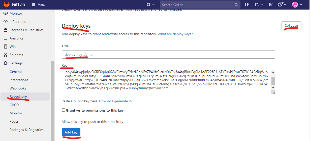 接着到了关键的一步,设置部署密钥。输入 key 的内容和标题后,点击 Add key 按钮。