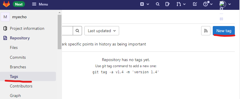 鉴于目前市面上使用最多的 git 私有托管工具是 gitlab,所以下面的教程内容会直接使用 gitlab (opens new window) 做演示。首先在 gitlab 上创建一个项目,https://gitlab.com/yunnysunny/myecho。提交完代码后,打开菜单 Repository -> Tags,点击 New tag 按钮,创建一个 git tag。